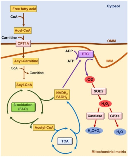 Mitochondrial function in healthy kidneys. Mitochondrial fatty acid β-oxidation (FAO) is the preferred pathway to generate ATP in kidney tubules. Fatty acids are converted in acyl-CoA in cytosol; they are conjugated with carnitine in the outer mitochondrial membrane (OMM) by carnitine palmitoyl-transferase 1A (CPT1A) to cross the inner mitochondrial membrane (IMM). In the mitochondrial matrix, acyl-carnitine is reconverted to acyl-CoA, and it enters the tricarboxylic acid (TCA) cycle. Reduced nicotinamide adenine dinucleotide (NADH2) and reduced flavin adenine dinucleotide (FADH2) generated by FAO and by the TCA cycle deposit their electrons into the electron transport chain (ETC). Electrons released by the ETC react with oxygen to form superoxide anion (O2−), which is converted to hydrogen peroxide (H2O2) by superoxidase dismutase 2 (SOD2). H2O2 can be reduced to water by antioxidant enzymes such as catalase and glutathione peroxidases (GPXs).