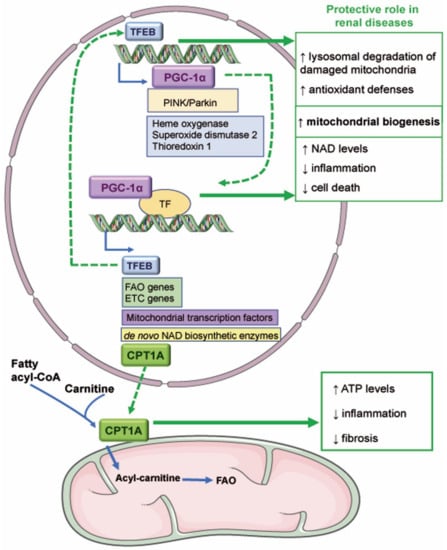 In recent years, accumulated evidence suggests a key role of mitochondria-related transcriptional regulators peroxisome proliferator-activated receptor gamma coactivator 1-alpha and transcription factor EB (PGC-1α, TFEB, respectively) and of carnitine palmitoyl-transferase 1A (CPT1A) in kidney disease (Figure 2).