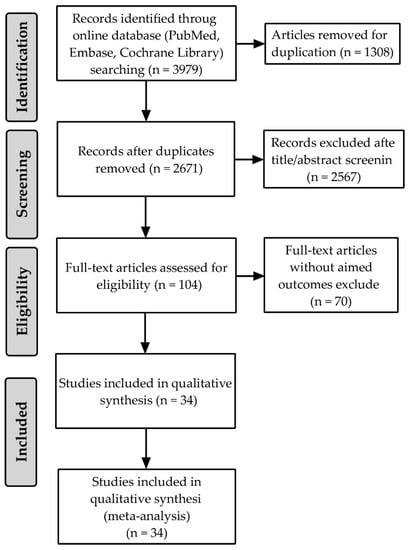 A total of 3979 studies were identified through the initial database search, 1308 of which were removed for duplication. After scanning through title and abstract, 2567 records were excluded. Correspondingly, we assessed the remaining 104 articles for eligibility. Based on the detailed reading of full texts, we finally included 34 RCTs in our analyses. The flow chart of systematic literature search for RCTs that met the study inclusion and exclusion criteria is shown in Figure 1.