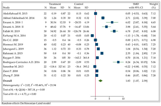 Fourteen studies with a total of 835 participants measured the circulating TAC after following the CoQ10 supplementation. Emami, A. et al. [33,34] conducted the trial in four parallel groups; thus we included CoQ10 + precooling versus precooling and CoQ10 versus placebo as the results of two independent studies. Hence, a forest plot exhibiting the pooled effect of fifteen arms is presented in Figure 2. TAC levels were significantly increased in participants treated with CoQ10 compared with placebo or others (SMD: 1.83, 95%CI: 1.07 to 2.59, p < 0.001). However, there was considerable heterogeneity between the studies ( p < 0.001). Sensitivity analysis showed that removal of individual studies one by one also did not change the results (see Appendix A Figure A2).