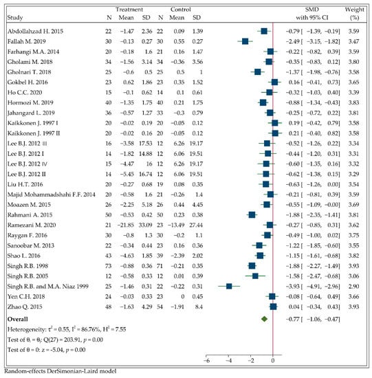 After combining the results of 28 arms from 25 trials, including a total sample size of 1501 participants, we found a significant effect of CoQ10 intervention on circulating MDA levels using the random-effects model (SMD: −0.77, 95%CI: −1.06 to −0.47, p < 0.001; Figure 3). Heterogeneity is significant ( p < 0.001). The overall effect was robust when we omitted individual study effects one by one for sensitivity analysis (see Appendix A Figure A3).