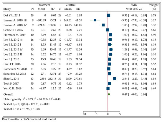 Based on the pooled results of all 16-arm studies including 694 participants, we could not yet determine that there was a significant increase in SOD levels after following the CoQ10 supplementation (SMD: 0.47, 95%CI: 0.00 to 0.94, p = 0.05; Figure 4). Sensitivity analysis demonstrated that after individually eliminating studies by Dai Y.L., Emami A., Gokbel H., Shao L. or Yen C.H. [33,47,52,53,63], the pooled effects of CoQ10 on SOD levels showed a significant elevation, as shown in Appendix A Figure A4.