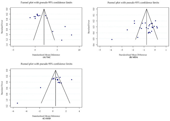 Funnel plots representing publication bias in the included studies relevant to the effect of CoQ10 supplementation on (A) TAC, (B) MDA and (C) SOD.