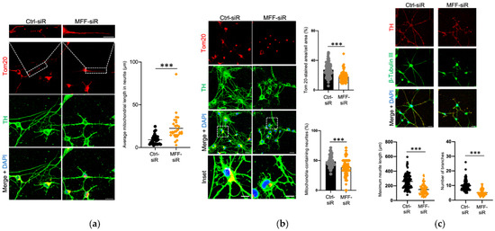 To investigate the role of MFF insufficiency on DN development and function, cells were treated with siRNA to silence MFF (MFF-siR) or negative control siRNA (Ctrl-siR) during differentiation. Low levels of MFF signals were detected only by the MFF-siR when compared to Ctrl-siR in the immunofluorescence images (Supplementary Figure S1a). A quantitative analysis showed that the MFF expression in the DNs was reduced to approximately 20% in the MFF-siR group, as compared to that in the Ctrl-siR group (Supplementary Figure S1b). The levels of DRP1 and the mitochondrial dynamics proteins of 49 and 51 kDa (MID49 and MID51, respectively), both of which are other DRP1-adaptors on the mitochondrial outer membrane (MOM), were not severely affected by the MFF-siR (Supplementary Figure S1a,c). Mitochondrial morphology was examined using immunofluorescence staining of Tom20, a marker of mitochondria, and TH, a marker of DNs. The average mitochondrial length was longer, and the Tom20-stained area per cell area and number of mitochondria-containing neurites were reduced in the MFF-siR group compared to the Ctrl-siR group (Figure 1a,b). An immunofluorescence analysis of the neuron morphology showed a shorter maximum neurite length and fewer neurite branches in the MFF-siR group (Figure 1c). The mRNA expression levels of NURR1, a transcription factor that is essential for DN differentiation, and its downstream target TH, were not significantly altered by the MFF-siR (Supplementary Figure S2). These results suggested that MFF insufficiency caused mitochondrial elongation, reduced the mitochondrial amount and distribution, and impaired neurite development.