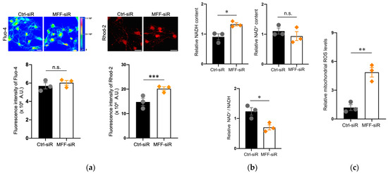 To clarify the functional alteration of mitochondria that appeared to be elongated in the MFF-siR group, Ca2+ levels were examined. Mitochondrial Ca2+ levels, rather than the cellular Ca2+ levels, were increased in the MFF-siR group compared to the Ctrl-siR group, which was also observed in immunofluorescence images that focused on neurites (Figure 2a and Supplementary Figure S3a). The physiological elevation of mitochondrial Ca2+ levels stimulates the tricarboxylic acid (TCA) cycle and oxidative phosphorylation [3,24,25]. Ca2+ overload can also induce excessive ROS generation, leading to severe mitochondrial and cellular damage [3,24,25]. To assess the effect of increased mitochondrial Ca2+ levels that are caused by the MFF-siR, the levels of NADH, which is generated via the TCA cycle, were measured. Consistent with the increased mitochondrial Ca2+ levels, the levels of NADH, rather than NAD+, were increased in the MFF-siR group (Figure 2b). Mitochondrial ROS levels were increased by the MFF-siR, which was also observed in the confocal microscopy images that focused on neurites (Figure 2c and Supplementary Figure S3b). However, MFF-siR did not induce apoptotic cell death (Supplementary Figure S4). Next, we examined whether mitochondrial Ca2+ and ROS accumulation also occurred in mitochondria that were elongated by the DRP1 insufficiency. DRP1 inhibition by siRNA did not alter MFF expression levels (Supplementary Figure S5a). This inhibition resulted in mitochondrial elongation but not Ca2+ accumulation (Supplementary Figure S5b,c). However, as shown in a previous report [36], mitochondrial ROS levels were elevated by DRP1 inhibition (Supplementary Figure S5d). These results suggest that MFF insufficiency might cause mitochondrial Ca2+ accumulation in the matrix to stimulate the TCA cycle and overproduction of ROS.
