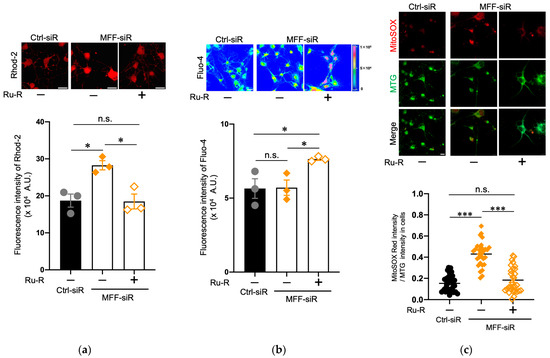 The mitochondrial calcium uniporter channel (mtCU) is located in the mitochondrial inner membrane (MIM) and is one of the critical regulators of Ca2+ entry into the mitochondrial matrix [3,37,38]. To elucidate the mechanisms of mitochondrial Ca2+ accumulation that is caused by MFF insufficiency, mtCU was blocked by its specific reagent, ruthenium red (Ru-R) [39]. Ru-R was added in the second step of DN differentiation, and the cells were subsequently cultured for 5 days (Figure 3). Upon Ru-R treatment, the elevated mitochondrial Ca2+ levels in the MFF-siR group were reduced to levels that were comparable to the untreated Ctrl-siR group (Figure 3a), while cytosolic Ca2+ levels were increased in the MFF-siR group that was treated with Ru-R (Figure 3b). Thus, in the MFF-siR group, mtCU inhibition might promote Ca2+ retention outside mitochondria or Ca2+ efflux from mitochondria, resulting in increased cytosolic Ca2+ levels. To confirm the active Ca2+ efflux from the mitochondria, Ru-R was applied only for a short period (4 h). This treatment also reduced the mitochondrial Ca2+ levels in the MFF-siR group to levels similar to that of the Ctrl-siR group, suggesting that mitochondrial Ca2+ was promptly released by mtCU inhibition (Supplementary Figure S6a,b). Furthermore, Ru-R treatment suppressed the mitochondrial ROS levels in the MFF-siR group to levels comparable to those seen in the untreated Ctrl-siR group (Figure 3c). This was also observed in the short-time treatment of Ru-R (Supplementary Figure S6c). Thus, mitochondrial Ca2+ accumulation that is caused by MFF insufficiency might be predominantly caused by excessive Ca2+ influx through mtCU, which might trigger ROS generation.