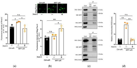 Apart from the mitochondria, the ER is also a major intracellular Ca2+ storage compartment, and Ca2+ moves from the ER to the mitochondria. The inositol 1,4,5-trisphosphate receptor (IP3R) of the ER membrane is a regulatory component of this pathway [40]. To clarify the role of the ER in mitochondrial Ca2+ accumulation that is caused by MFF insufficiency, we used Xest-C, a specific inhibitor of IP3R [41]. The elevated mitochondrial Ca2+ levels in the MFF-siR group were reduced by Xest-C treatment to levels that were comparable to the untreated Ctrl-siR group (Figure 4a). Conversely, the Ca2+ levels of the ER were increased in the MFF-siR group that was treated with Xest-C (Figure 4b). Thus, in the DNs with MFF insufficiency, mitochondrial Ca2+ accumulation might be caused by enhanced Ca2+ influx from the ER through the activation of IP3R. Together with IP3R, the VDAC1 of MOM is an important component of the Ca2+ transport pathway, suggesting that MFF on MOM might participate in VDAC-mediated Ca2+ entry. To test this possibility, an IP analysis was performed using anti-MFF and anti-VDAC1 antibodies in untreated DNs. A Western blot analysis showed that the anti-MFF antibody co-precipitated VDAC1 with MFF (Figure 4c, Supplementary Figure S7). DRP1 was also co-precipitated under this condition (Figure 4c, Supplementary Figure S7), suggesting that the anti-MFF antibody captured DRP1-mediated fission machinery and Ca2+ transport machinery, both of which might share MFF. Alternatively, VDAC1 is an essential component of Ca2+ transport machinery, but not of DRP1-mediated fission machinery. To exclusively capture Ca2+ transport machinery but not DRP1-mediated fission machinery, IP was performed using an anti-VDAC1 antibody. A Western blot analysis showed that MFF, and not DRP1, was co-precipitated with VDAC1 using the anti-VDAC1 antibody (Figure 4c, Supplementary Figure S7), suggesting that the anti-VDAC1 antibody might capture the Ca2+ transport machinery containing VDAC1 and MFF, but it does not capture the DRP1-mediated fission machinery lacking VDAC1. Consistent with the reduction in mitochondrial Ca2+ levels, mitochondrial ROS levels were recovered in the MFF-siR group that was treated by Xest-C (Figure 4d). An immunofluorescence co-staining analysis using SEC61 translocon subunit beta (SEC61B), a marker of ER, and Tom20, a marker of mitochondria, suggested increased contact between ER and mitochondria in the MFF-siR group (Supplementary Figure S8). These results suggest that MFF is involved in negatively modulating Ca2+ influx as a component of Ca2+ transport machinery, and therefore, MFF insufficiency may contribute to mitochondrial Ca2+ accumulation, triggering ROS overproduction.