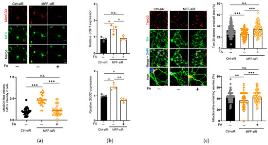 We hypothesized that the reduced mitochondrial amount and impaired neurite development in the DNs with MFF insufficiency were associated with mitochondrial Ca2+-triggered ROS overproduction. To test this hypothesis, FA was used in this study, because it affects ROS scavenging and mitochondrial activation via one-carbon metabolism [42,43,44]. FA supplementation did not alter the mitochondrial morphology and Ca2+ accumulation in the MFF-siR group (Supplementary Figure S9). However, FA supplementation recovered mitochondrial ROS levels in the MFF-siR group (Figure 5a). Transcription of the endogenous antioxidant enzymes SOD1 and SOD2 is sensitive to ROS levels. Both SOD1 and SOD2 transcripts were upregulated in the MFF-siR group and were downregulated by FA supplementation, in correlation with ROS levels (Figure 5b). FA supplementation improved the mitochondrial amount and distribution in the MFF-siR group (Figure 5c).