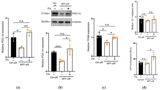 These improvements correlated with the alteration of both mRNA and protein levels of PGC-1α, a master regulator of mitochondrial biogenesis (Figure 6a,b). This was also supported by the expression levels of mitochondrial transcription factor A (TFAM), a downstream target of PGC-1α, in the MFF-siR group before and after FA supplementation (Figure 6c). FA supplementation did not alter MMP but increased the ATP levels (Figure 6d).