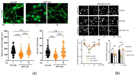 FA supplementation improved developmental defects in DNs with MFF insufficiency. (a) DNs were stained with anti-TH antibodies and DAPI. Scale bars = 25 μm. Maximum neurite length and number of branches per cell are shown. The mean ± SEM was taken from three independent experiments. n.s., not significant, *** p < 0.001. (b) DNs were stimulated with 50 mM of KCl for the indicated times and subsequently stained with anti-dopamine antibodies. Scale bar = 25 μm. Dopamine staining intensity per cell area was measured for 30 cells of each case. The mean ± SEM was taken from three independent experiments. Extracellular dopamine levels were measured under basal conditions and a 50 mM-KCl stimulated condition. The mean ± SEM was taken from three independent experiments. n.s., not significant, * p < 0.05, ** p < 0.01.