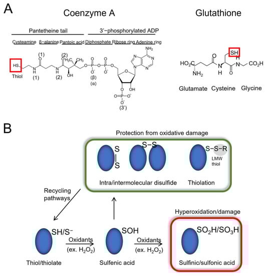 Glutathione is a tripeptide (γ-glutamyl-cysteinyl-glycine) comprising three amino acids (cysteine, glutamic acid and glycine), whereas CoA is composed of a 3′-phosphorylated ADP moiety and a flexible pantetheine tail. Although structurally different, both molecules contain a reactive thiol group, allowing them to interact with a diverse range of substrates (Figure 1A). During oxidative stress, the physiological level of oxidants (e.g., hydrogen peroxide—H2O2) increases, leading to the oxidation of proteins at cysteine and methionine residues. The thiol group of cysteine residues can become oxidized to sulfenic acid (RSOH). A prolonged exposure to higher levels of oxidants can cause the hyperoxidation of cysteine residues to sulfinic acid (mostly irreversible modification) and even sulfonic acid (irreversible modification) [1,17]. When sulfenic acid is formed on a cysteine, LMW thiols (GSH, BSH, MSH and CoA) can perform a nucleophilic attack on the sulfur atom of the sulfenic acid and form a mixed-disulfide bond in a process termed thiolation (glutathionylation, bacillithiolation, mycothiolation and CoAlation). This prevents the hyperoxidation of the protein cysteine and in many cases, its irreversible loss of function [8,10,18,19,20,21] (Figure 1B). Protein thiolation could also occur through thiol-disulfide exchange reactions. Furthermore, sulfenic acids can also react with hydrogen sulfide to form persulfides, which are involved in physiological and pathological processes [22]. In the latter case of thiol-disulfide exchange reactions, there could be an interplay between persulfides and CoA. Overall, the formation of a mixed-disulfide bond with proteins can modulate the activity, structure, subcellular localization and regulatory interactions of modified proteins.
