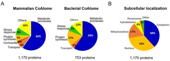 Functional analysis of CoAlated proteins and their subcellular localization. (A) Pie charts representing the molecular functions of mammalian and bacterial CoAlated proteins are shown. The percentages were calculated based on PANTHER (Protein ANalysis THrough Evolutionary Relationship—version 16) outputs. For both pie charts, metabolic processes represent the most predominant functional group of all CoAlated proteins. Important to note is that within the bacterial dataset (923 proteins), 170 proteins had unknown functions and therefore, only 753 proteins were used for the PANTHER analysis. (B) Pie chart representing the subcellular localization of mammalian CoAlated proteins. The segregation of CoAlated proteins using DAVID database revealed that the majority of CoAlated proteins are located within the cytoplasm, followed by the nucleus and mitochondria.