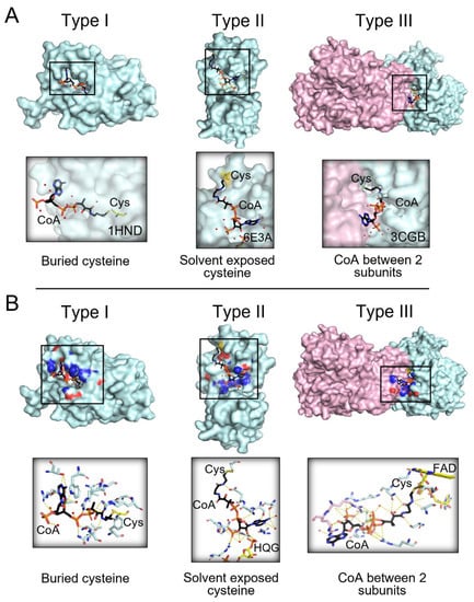 Understanding how CoAlation can regulate downstream signaling and the function of modified proteins is of great importance to further unravel its cellular antioxidant role. Therefore, we studied the site of CoAlation by searching for known 3D structures of CoAlated proteins from the Protein Data Bank (PDB). A total of 35 structures were observed to have either CoA covalently bound to the protein (CoAlated) or the CoA thiol group located less than 3 Å away from the protein cysteine thiol (Table S3). From the structures analyzed, we found three main types of CoA binding to proteins (Figure 3 and Figure S1). Categorization of the types of CoA binding focused on the localization of the CoAlated cysteine residues. In general, cysteines can be either buried within the protein structure or solvent exposed. In Type I CoAlated proteins, CoA interacts with a buried cysteine residue (11 of 35 structures) (Figure 3 and Table S1). In this case, the surface residues of the protein could potentially initiate the stabilization of the ADP moiety, leading to local structural changes that allow the pantetheine tail to gain access to the buried cysteine residue located within a defined groove/pocket. This allows the formation of a mixed-disulfide bond (Figure 3—Type I). On the other hand, in Type II CoAlated proteins, CoA interacts with a solvent exposed cysteine (10 of 35 structures). In this case, surface residues mainly stabilize both the ADP moiety and the pantetheine tail, which could potentially project the thiol group of CoA to the targeted Cys residue (Figure 3—Type II).