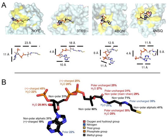 We then investigated the different types of amino acid residues (non-polar aliphatic, non-polar aromatic, polar uncharged, and positively or negatively charged) interacting directly or via water molecules through their side chain or main chain with the different CoA segments (pantetheine tail and ADP moiety) (Figure 1A and Figure 4B—Table S3). Both PyMol and LigPlot+ were used to analyze the CoA–protein stabilization interactions (hydrogen bonding, salt bridges and hydrophobic interactions (Van der Waals interactions and π–π interactions)), and the results are summarized in Table S3 and Figure 4B.