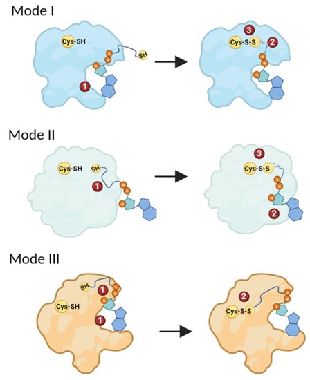 Based on the current available literature and the CoA–protein stabilization interactions analyzed in this study, we suggest three main possible modes of CoA binding to proteins (Figure 5). Within the first mode of CoA binding, protein CoAlation is initiated by the stabilization of the 3′-phosphorylated ADP moiety of CoA. This stabilization occurs within a hydrophobic patch composed of non-polar aliphatic amino acids, and/or aliphatic aromatic amino acids, which can stabilize the adenine ring of the ADP moiety by π–π interactions. Binding of the ADP moiety can lead to local structural changes that prime the pantetheine tail to gain access to the protein thiol group, whether it is located in a deep catalytic pocket (buried) or solvent exposed, and form a disulfide bond (Figure 5—Mode I). The structural-functional analysis of CoAlated aurora kinase A shows that CoA binds to the protein using the proposed mode, where the CoA ADP moiety binds to the aurora kinase A first, priming the stabilizing of the pantetheine tail and disulfide bond formation [28].