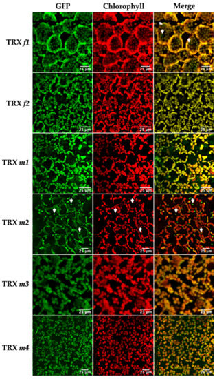 Arabidopsis plants were transformed with pGWB4-derived constructions expressing the proteins, translationally fused with GFP, of the different TRXs f and m [23]. Genes, including 1-kb promoters, were cloned into a pGWB4 vector by using the Gateway technology (Invitrogen, Life Technologies Corp., Carlsbad, CA, USA). A total of six constructions were obtained. Cloning oligos are shown in Table S1.
