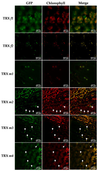 Among the TRXs present in chloroplasts, f- and m-types are the most diverse. In this work, we wanted to delve into the specific functions of these key redox proteins in photosynthetic and heterotrophic tissues. For this purpose, in order to know where these proteins are operating, we first carried out comprehensive expression analyses in Arabidopsis organs. As the average length promoter in Arabidopsis might be established at 500 bp [35], GFP translational fusions included a 1-kb DNA fragment upstream of the start codon. Regulatory sequences display putative binding motifs to transcription factors present in genes expressed in roots and flowers or involved in C metabolism, light regulation, seed and embryo development, and stress responses (data not shown). Confocal microscopy observations confirmed the functionality of the different translational fusions, as we expected GFP signals to be localized in chloroplasts. A rather surprising result was the observation of the TRXf1::GFP protein outside the chloroplast, not discarding the possibility of a dual localisation (probably in a smaller organelle). This result, although surprising, would support the experimental results previously obtained by Senkler and co-workers [36], which consisted of detecting TRX f1 in mitochondria by proteomic analyses in Arabidopsis. The use of a specific fluorescence probe for mitochondria would confirm this alternative localisation. Curiously, Arabidopsis TRX m2 is able to interact in vivo with the protein AtVDAC3 in mitochondria [37], pointing to a dual localisation for this m-type isoform. The presence of two isoforms of TRX f is not usual in plants, being, to date, the only known case in plants. This duplication in Arabidopsis (presumably TRX f2, due to its lower expression) might have started a specialization process, providing an adaptive advantage which would have helped to maintain a high selective pressure so that both isoforms can coexist.