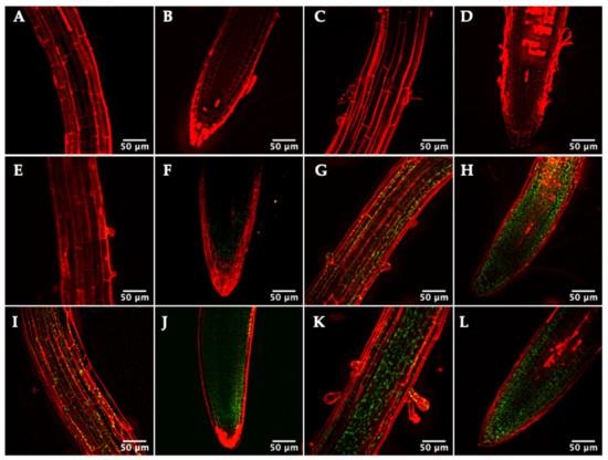 For the detection of the fluorescence signal and the capture of high-resolution images in different organs, the Confocal Laser Scanning Microscopy Modular System C-1 (Nikon Instruments Europe B.V., Badhoevedorp, The Netherlands) was used [24]. For staining with propidium iodide (PI), 5-day-old roots were incubated in the dark for 10 min in a 10 µg/mL solution. Then, roots were washed with distilled water before microscope observation [25].