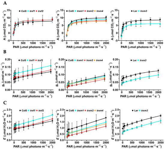 Infrared gas analyser measurements in WT (Col0 and Ler) and trxf and trxm mutant lines. (A) Light-response curves for the rate of photosynthetic CO2 assimilation (A); (B) stomatal conductance (gs); (C) transpiration (E). Arabidopsis plants were grown for 4 weeks.