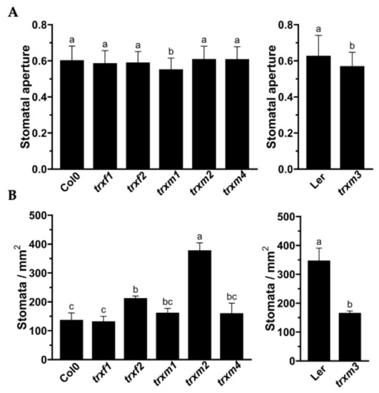 Stomatal characterization in WT (Col0 and Ler) and trxf and trxm mutant lines. (A) Stomatal aperture calculated as the width/length ratio. (B) Stomatal density of the adaxial leaf epidermis. Stomatal measurements were carried out with ImageJ 2.0.0. Different letters indicate a statistically significant difference (p < 0.05) according to a one-way analysis followed by a Tukey’s post hoc test. n = 50 per genotype.