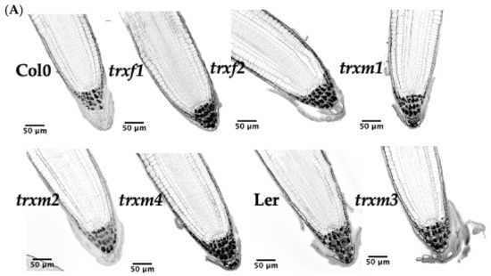 Detecting the TRX m::GFP signal in roots led us to study the root phenotype in the TRX loss-of-function Arabidopsis mutants, extending our analyses to the knock-out trxf lines too. By staining the apical region of the roots with PI, we observed different structures such as the elongation area, the meristematic zone (xylem, phloem and pericycle cells) and the columella (Figure 7A). Starch granules increased in the columella of lines trxf1, trxf2 and trxm4, decreased in trxm3, and were similar in trxm1 and trxm2 with respect to the WT line (Figure 7A,B). No significant differences were detected in the starch granules of the mutant line trxm3 in relation to its control line Ler. Regarding root dimensions, trxf2, trxf1, trxm4 and trxm2 root widths were slightly higher than for Col0 (in the listed order), while the line trxm1 showed a similar size. Additionally, the size of the columella of trxf2 was apparently bigger than for Col0. Finally, the trxm3 root tip was similar to its WT line (Figure 7).
