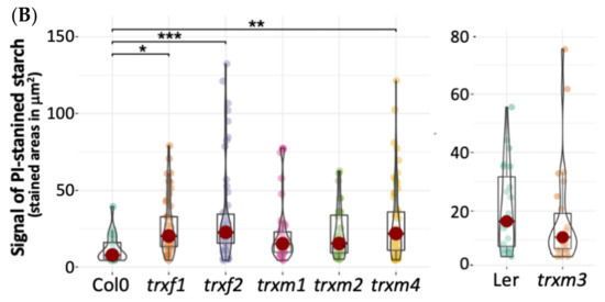 Root tip structure and starch signals in columella of WT (Col0 and Ler) and trxf and trxm mutant lines. (A) Root cells and starch granules were stained with propidium iodide (PI) and imaged with confocal microscopy. Arabidopsis seedlings were grown for 7 days. (B) Quantification of starch areas stained with PI (using the free software ImageJ 2.0.0). Asterisks above the violin graph indicate statistically significant differences (* p ≤ 0.05, ** p ≤ 0.01, *** p ≤ 0.001) as determined using the Kruskal–Wallis test and Dunn’s test.