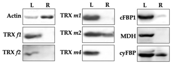- Traverso, J.A.; Vignols, F.; Cazalis, R.; Serrato, A.J.; Pulido, P.; Sahrawy, M.; Meyer, Y.; Cejudo, F.J.; Chueca, A. Immunocytochemical localization of Pisum sativum TRXs f and m in non-photosynthetic tissues. J. Exp. Bot. 2008, 59, 1267–1277. [Google Scholar] [CrossRef][Green Version]