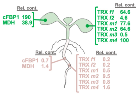 Protein relative content of plastid thioredoxins and their classical targets cFBP1 and MDH in cotyledons and roots of Arabidopsis. Presented values are relative to that of the most abundant TRX in cotyledons (TRX m4). Data were obtained from the database “Proteomics DB” (ProteomicsDB: a multi-omics and multi-organism resource for life science research. Available online: https://www.proteomicsdb.org/, accessed on 16 June 2022).