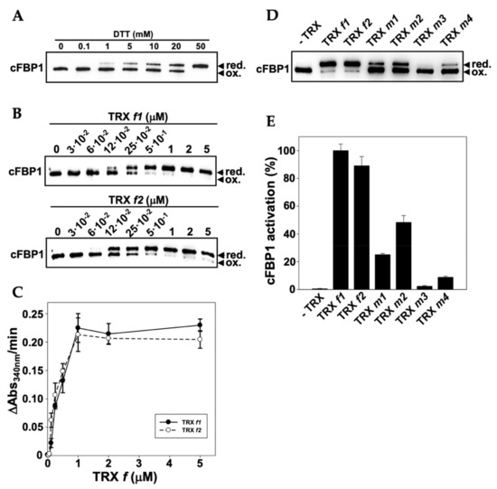 For redox activation assays, 2.5 μM cFBP1 was incubated for 30 min at 22 °C with DTT (concentration depending on the assay) or 0.1 mM DTT and TRX (concentration depending on the assay) in the presence of 100 mM Tris-HCl (pH 8.0). Then, free thiols were alkylated by incubation in the dark for 30 min at 37 °C in the presence of equal volumes of a solution containing 60 mM iodoacetamide, 2% SDS, and 100 mM Tris-HCl pH 8. FBPase redox state was determined by Western blotting analyses as published by Serrato and co-workers (2018) [22].