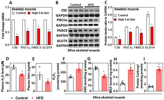 Mice fed a HFD for 16 weeks showed a metabolic phenotype similar to that of obese T2DM human subjects. In the muscle of HFD-fed mice, the expression of CSE decreased along with that of the gene, which encodes for the protein FNDC5, and its cleaved product irisin was downregulated (Figure 1A–C). The genes involved in glucose homeostasis, PGC-1α, and GLUT4, were significantly downregulated in the muscle of HFD-fed mice compared to those of the control group (Figure 1A–C). Furthermore, the levels of plasma H2S and irisin decreased significantly, and those of oxidative stress markers, such as H2O2, MDA, and protein carbonyl, increased in HFD-fed mice muscle compared to those of controls (Figure 1D–I). This suggests that a decreased status for the antioxidants GSH, H2S, and excess oxidative stress in the muscle of diabetic mice blunts the expression of FNDC5 and the levels of myokine irisin.
