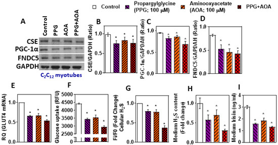 Effect of H2S producing enzyme inhibitors (propargylglycine or aminooxyacetate) on CSE-H2S, PGC-1α, FNDC5 (irisin), and glucose uptake in C2C12 mouse myotubes. Differentiated myotubestreated with propargylglycine (PPG; 100 µM) oraminooxyacetate (AOA; 100 µM) or a combination of both for 6 h. (A) Western blot analysis (CSE, PGC-1α, and FNDC5) was performed on total protein extracts (n = 3 independent experiments) in mouse myotubes; (B–D) semi-quantitative analysis of the abundance ratio of protein to GAPDH. (E) RT-qPCR was performed to assess the level of the GLUT4 gene, as indicated (n = 3). (F) Glucose uptake; (G) levels of intracellular H2S; (H) cell culture medium H2S; (I) cell culture medium irisin levels. One-way ANOVA followed by SNK (Student’s Newman–Keul’s) means comparison was performed between the control and treatment groups. * p ≤ 0.05 was considered significant for a statistical test. Data are expressed as mean ± SEM.