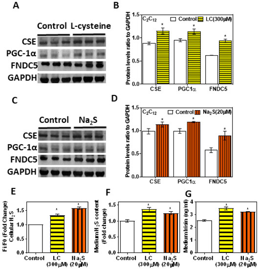 Effect of treatment with l-cysteine and sodium sulfide (a donor of H2S) on C2C12 mouse myotube CSE-H2S, PGC-1α, and FNDC5 (irisin). Differentiated myotubes treated with either l-cysteine (LC; 300 µM) or sodium sulfide (Na2S; 20 µM) for 6 h. (A,C) Western blot analysis (CSE, PGC-1α, and FNDC5) was performed on total protein extracts (n = 3 independent experiments) in mouse myotube; (B,D) semi-quantitative analysis of the abundance ratio of protein to GAPDH. (E) Levels of intracellular H2S; (F) cell culture medium H2S; (G) cell culture medium irisin level. The Student’s t-test was used to compare the controls with the LC/Na2S group. One-way ANOVA followed by SNK (Student’s Newman–Keul’s) means comparison was performed between the control and treatment groups. * p ≤ 0.05 was considered significant for a statistical test. Data are expressed as mean ± SEM.