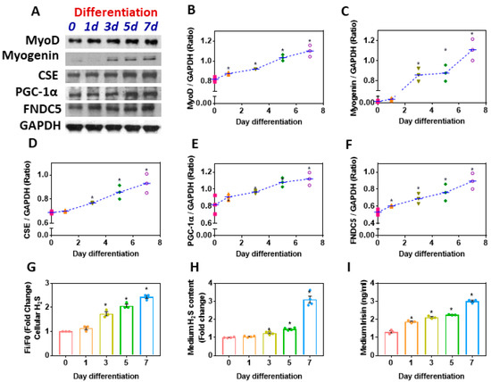 Effect of the myogenic commitment to differentiate C2C12 myoblasts into myotubes on the levels of CSE-H2S, PGC-1α, and FNDC5 (irisin). C2C12 cells grown to confluence and differentiated into myotubes were cultured in DMEM with 2% horse serum for up to 7 days. (A) Western blot analysis to monitor the expression of myogenic factors (MyoD, myogenin) and CSE, PGC-1α, and FNDC5 was performed on total protein extracts (n = 3 independent experiments) during C2C12 cell differentiation at days 0, 1, 3, 5, and 7 of myogenesis; (B–F) semi-quantitative analysis of the abundance ratio of protein to GAPDH. (G) Intracellular H2S levels; (H) cell culture medium H2S; (I) cell culture medium irisin levels. One-way ANOVA followed by SNK (Student’s Newman–Keul’s) means comparison was performed between the control and treatment groups. * p ≤ 0.05 was considered significant for a statistical test. Data are expressed as mean ± SEM.