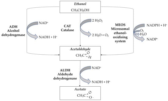 As shown in Figure 1, three metabolic pathways participate in the first step of ethanol metabolism: alcohol dehydrogenase (ADH), catalase (CAT), and the microsomal ethanol oxidation system (MEOS). ADH and aldehyde dehydrogenases (ALDH) are phase I enzymes that catalyze the first and the second oxidation step, respectively [12,13]. ADH has a high affinity but low capacity for ethanol; therefore, CAT has a prominent role in heavy ethanol consumers, while MEOS is induced by chronic ethanol consumption [14]. The CAT pathway plays a central role in ethanol oxidation in the brain [15]. MEOS is involved in ethanol oxidation by the cytochrome P450 (CYP) enzymes including CYP2E1, CYP1A2, and CYP3A4 isoforms [16]. Increased ethanol metabolism rates may contribute to the development of AD: faster ethanol inactivation during long-term alcohol drinking may increase the motivation to consume more alcohol to maintain a desired level of ethanol at target sites [16].