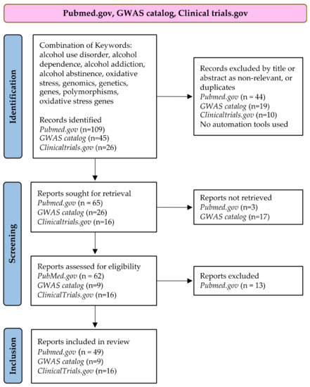 For the PubMed.gov search, we used the following combination of keywords: alcohol use disorder, alcohol dependence, alcohol addiction, alcohol abstinence, oxidative stress, genomics, genetics, genes, polymorphisms, and oxidative stress genes.
