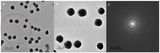 The optimized quercetin-loaded nanoemulsion (QNE) was developed as per the method reported in our previously published literature [19]. The optimized QNE comprised of QT (10 mg), CAP MCM NF (250 mg), CR RH 40 (250 mg), with a volume made up to 10 mL using Milli-Q water. Morphological assessments of QNE were performed using HR-TEM. Negative (-ve) staining was performed using PTA (-ve stain) to attain distinct morphological findings. PTA is a typical -ve stain that generally works at a pH range of 6.0 to 8.0 [21]. As per the HR-TEM analysis, QNE were homogeneously distributed, and exhibited stability with a particle size of 50 nm, spherical appearance, and smoother surface (Figure 1A,B). These results are similar to earlier published results [22,23]. Bouchemal et al. reported that parameters including the viscosity of oil, HLB values of surfactants, and miscibility of solvent systems with an aqueous phase play a crucial role in governing the size and morphology of nanoemulsion systems [22]. Moreover, the results of SAED suggested that the QNE exhibited an amorphous nature, showing proper incorporation of the drug within the excipient core system (Figure 1C). Similar findings regarding the effect of excipients on the crystallinity of drug moieties were reported in earlier works from the literature [23,24].