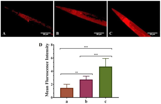 Effect of pure QT and QNE on the mitochondrial changes in transgenic C. elegans NL5901: (A) control (OP50 only), (B) worms treated with pure QT, (C) worms treated with QNE, and (D) mean Fint. for (a) control (OP50 only), (b) worms treated with pure QT, (c) worms treated with QNE; (n = 10). One-way ANOVA followed by Tukey’s test was performed for the quantification of graphically represented mean Fint. (mean ± SD; ** p < 0.01, *** p < 0.001).