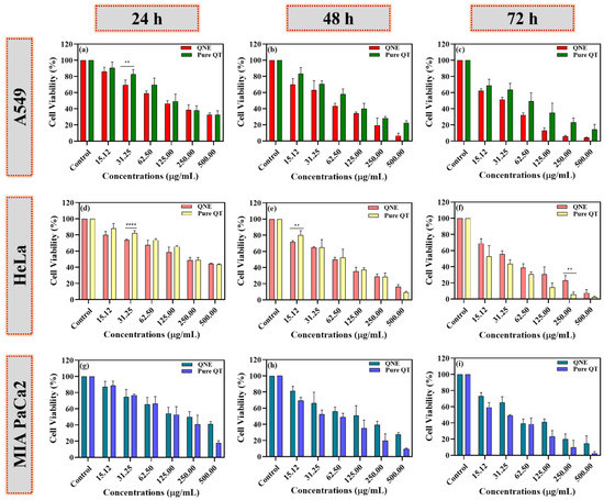 However, the presence of surfactant and oil in QNE could have increased the cytotoxic potential of pure QT against the treated human cancer cells. The chemotherapeutic potential of QT is mainly due to its ability to promote cell viability loss, apoptosis, and autophagy through the modulation of various molecular pathways associated with cancer progression [26]. In our study, QNE showed potential cytotoxicity against treated HeLa cells (Figure 6a), A549 cells (Figure 6d), and MIA PaCa-2 cells (Figure 6g), with IC50 values of 34.25 ± 1.213 µg/mL, 40.33 ± 6.221 µg/mL, and 43.58 ± 9.160 µg/mL, respectively, at 24 hr. In addition, the pure QT-treated cells also exhibited potential chemotherapeutic activity against treated HeLa cells (Figure 6a), A549 cells (Figure 6d), and MIA PaCa-2 cells (Figure 6g), with IC50 values of 63.23± 1.884, 63.46 ± 8.485, and 84.14 ± 8.607, respectively, at 24 h. The IC50 values of pure QT-treated carcinogenic cells were found to be more than QNE-treated carcinogenic cells, signifying QNE exhibits superior activity at 24 h treatment. Moreover, similar findings were observed in earlier studies for HeLa cells [27,28], A549 cells [29,30], and MIA PaCa-2 cells [31,32]. Moreover, there were no significant differences between the pure QT and QNE against carcinogenic cells, except for few concentrations including: A549 (31.25 µg/mL; p < 0.01), HeLa cells (31.25 µg/mL; p < 0.0001) at 24 h; HeLa cells (15.12 µg/mL; p < 0.01) at 48 h; and HeLa cells (250 µg/mL; p < 0.01) at 72 h of treatment. This shows that QNE exhibited superior activity against HeLa cells and A549 cells at a lower concentration.