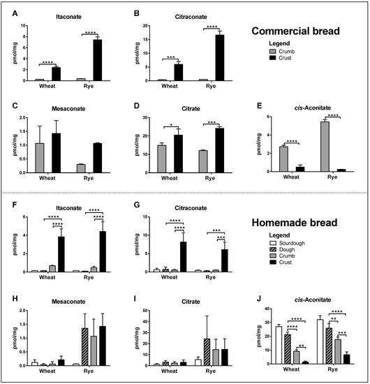 All three isomers were readily detected in the crumb and crust of common commercially available brands of wheat and rye bread. Concentrations of itaconate and citraconate were significantly higher in crust than in crumb, whereas differences in mesaconate were much smaller and not significant (Figure 2A–C). Citrate concentrations were also significantly higher in crust, whereas cis-aconitate concentrations were higher in crumb (Figure 2D, E). Itaconic and citraconic acids can be produced by heating citric acid, whereby itaconic acid additionally arises upon the heating of cis-aconitic acid [14,15] and mesaconic acid is a by-product of heating citraconic acid [19]. To test whether any of these isomers accumulated during baking, we measured their concentrations in homemade wheat and rye bread, comparing sourdough starter, unbaked dough, crumb and crust. Low concentrations of all isomers were detected in sourdough, dough and crumb, and significantly higher concentrations of itaconate and citraconate in crust (Figure 2F–G). Mesaconate differed in that only a mild increase was detected in the crust of wheat bread, but higher concentrations in the dough of rye bread, which did not increase further in crust (Figure 2H). Citrate gave similar results to mesaconate, which were not significant (Figure 2I). Of note, cis-aconitate concentrations decreased significantly in wheat and rye bread, from sourdough (highest) to crust (lowest) (Figure 2J).