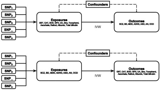 Moreover, it remains controversial as to whether such an oxidative stress injury is a cause or a downstream effect of psychiatric disorders. In such cases, the Mendelian randomization (MR) study provides the genetic variants from genome-wide association studies as instrumental variables (IVs) for environmental exposure to make causal inferences about the outcome [21]. To unveil the causal associations between oxidative stress injuries and psychiatric disorders, a two-sample bidirectional MR study was conducted.