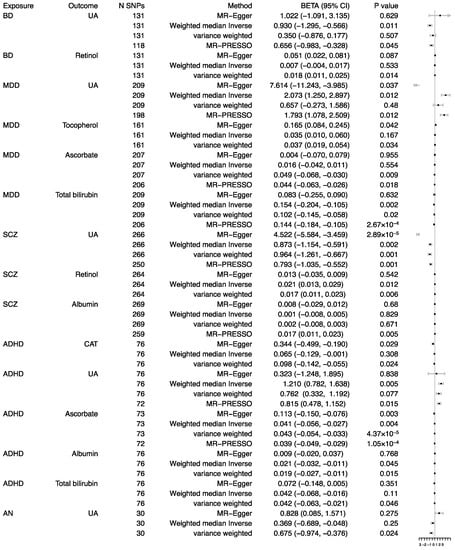 As for ADHD, ADHD was nominally associated with decreased albumin (beta = −0.019, 95% CI ranges from −0.027 to −0.011, p = 0.015; p of egger intercept = 0.320), decreased bilirubin (beta = −0.042, 95% CI ranges from −0.011 to −0.063, p = 0.046; p of egger intercept = 0.685; this causal effect disappeared in weighted median method), and decreased CAT (beta = −0.098, 95% CI ranges from −0.142 to −0.055, p = 0.024; p of egger intercept = 0.101; this causal effect disappeared in weighted median method). There were also nominal causal effects on increased UA (four outliner SNPs, beta = 0.815, 95% CI ranges from 0.478 to 1.152; p of egger intercept = 0.772; the effect was consistent in the weighted median method) after excluding the outliner SNPs.