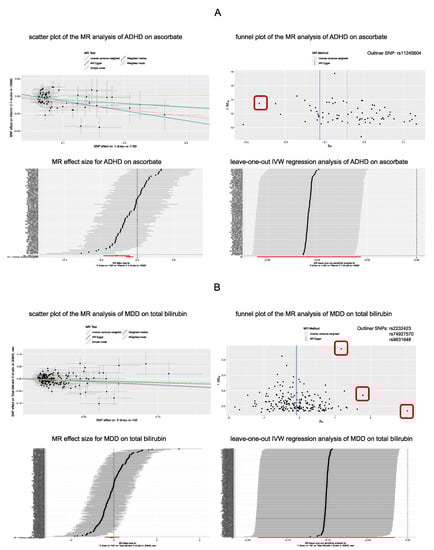 Results of the reverse MR analysis showed that there was a significant causal effect of MDD on total bilirubin after excluding one outliner SNP. The causal effect estimate was −0.144 (95% CI ranges from −0.184 to −0.105, p = 2.67 × 10−4), which is consistent in the weighted-median method (beta = −0.154, 95% CI ranges from −0.204 to −0.105, p = 0.002). The Egger intercept did not identify any pleiotropic SNP (p of egger intercept = 0.910). Moreover, genetically predicted ADHD showed a causal effect on ascorbate (beta = −0.034, 95% CI ranges from −0.054 to −0.033, p = 4.37 × 10−5), and there was no directional pleiotropy (p of egger intercept = 0.053). After we excluded 1 outliner SNP, the causal effect was still significant (beta = −0.039, 95% CI ranges from −0.049 to −0.029, p = 1.05 × 10−4), and the findings of the sensitivity analysis were consistent (Figure 3 and Figure 4).