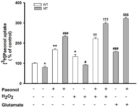 Treatment of H2O2 and glutamate and restoration effect of paeonol on the uptake of [3H]paeonol. [3H]Paeonol uptake in WT and MT cell lines pretreated with H2O2 (300 µM) either alone or in the presence of 100 µM of paeonol. MT cell line exposed to glutamate in the presence or absence of paeonol. [3H]Paeonol uptake was performed 24 h after pretreatment of cell lines at pH 7.4 and 37 °C. Each value represents the mean ± SEM (n = 3–4). * p < 0.05 and ** p < 0.01, significant difference vs. WT control; # p < 0.05 and ### p < 0.001, significant difference versus MT (vehicle); †† p < 0.01 and ††† p < 0.001, significant difference vs. H2O2; $$$ p < 0.001, significant difference vs. glutamate.