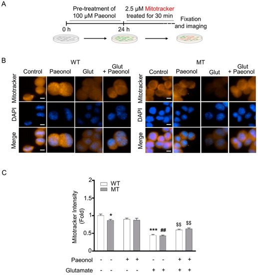 Paeonol prevents glutamate-induced decrease of mitochondrial membrane potential (ψ) in a cell line model of ALS. (A) A scheme presenting paeonol pre-treatment, glutamate treatment and MitoTracker staining. (B) Photo-images show that paeonol recovers glutamate-induced decrease of mitochondria membrane potential in WT and MT cell lines. Motor neurons were stained with MitoTracker-Red for 30 min prior to fixation and subjected to DAPI staining. (C) Paeonol significantly recovered glutamate-induced decrease of mitochondrial membrane potential. Cell count, n = 20 per each group. The graph data represent the mean ± SEM. * p < 0.05, and *** p < 0.001, significant different versus WT control; ## p < 0.01, significant different versus MT (vehicle); $$ p < 0.01, significant difference vs. glutamate. Scale bars (white): 10 μm.