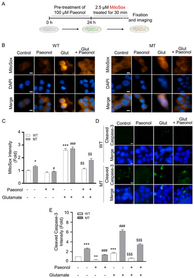 Paeonol prevents glutamate-induced elevation of mitochondrial oxidative stress in a cell line model of ALS. (A) A scheme presenting paeonol pre-treatment, glutamate treatment, and MitoSox staining. (B) Photo-images show that paeonol decreased glutamate-induced mitochondrial oxidative stress in WT and MT ALS cell lines. Motor neurons were stained with MitoSox for 30 min prior to fixation and subjected to DAPI staining. (C) Paeonol significantly reduced mitochondrial oxidative stress by glutamate. Cell count, n = 20 per each group. (D) Photo-images show that paeonol reduced glutamate-induced cleaved caspase-3, a cell death marker, in WT and MT ALS cell lines. (E) Paeonol significantly reduced cleaved caspase-3 by glutamate. Cell count, n = 30 per each group. The graph data represent the mean ± SEM. * p < 0.05, ** p < 0.01, and *** p < 0.001, significant difference at versus WT control; # p < 0.05, and ### p < 0.001, versus MT (vehicle), $$ p < 0.01 and $$$ p < 0.001, significantly difference vs. glutamate. Scale bars (white): 10 μm.