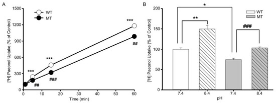 Characteristics of [3H]paeonol uptake are altered in NSC-34 cell lines. (A) [3H]Paeonol time course was observed for 0–60 min at pH 7.4 at 37 °C using ECF buffer solution in both WT and MT cell lines. (B) pH-dependent uptake was carried out for 5 min at pH 7.4 and 8.4 in both cell lines. Each value represents the mean ± SEM (n = 3–4). Significantly different at * p < 0.05, ** p < 0.01, *** p < 0.001. versus WT control; ## p < 0.01, ### p < 0.001, versus MT (vehicle).