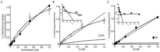 [3H]Paeonol concentration-dependent uptake in ALS model cell lines. (A) Uptake was carried out under physiological pH 7.4 and temperature 37 °C either in the absence or presence of cold paeonol at concentrations ranging from 0 to 1 mM for 5 min (B) in WT and (C) MT cell lines. Insets graphs are the Eadie–Hofstee plots (B,C). Each point represents the mean ± SEM (n = 3).