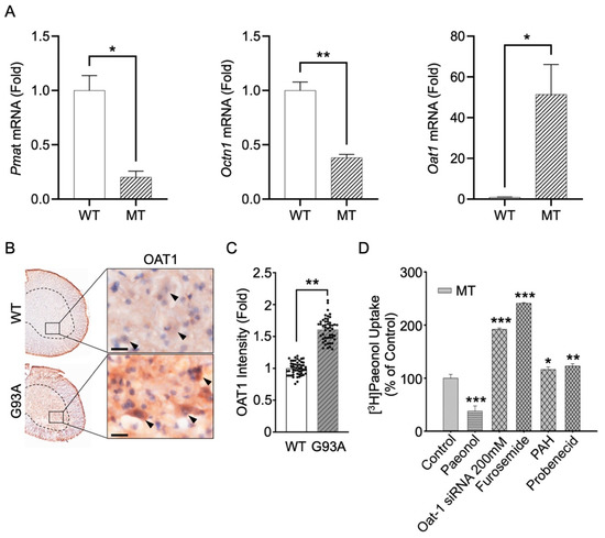 Pmat and Octn1 genes are downregulated, whereas Oat1 gene is upregulated in a cell line model of ALS. (A) qRT-PCR analysis confirmed that Pmat and Octn1 mRNAs are significantly reduced, whereas Oat1 mRNA is significantly increased in MT cell line compared to the control WT cell line. Target mRNA levels were normalized to GAPDH. The data represent the mean ± S.E.M of three separate experiments. * p < 0.05 and ** p < 0.01, significant difference vs. control (WT). (B) OAT1 immunoreactivity was decreased in the motor-neuron of G93A ALS transgenic mice compared to wild-type (WT). The nuclei were counterstained with hematoxylin. Scale bars (black): 20 μm. Arrowheads (black) indicate the OAT1 immunoreactivity in motor neurons. (C) The intensity of OAT1 was significantly increased in motor-neuron of G93A ALS transgenic mouse (each case, N = 5; cell counting, n = 10 (10 cells/case)). ** p < 0.01, significant difference vs. control (WT). (D) Effects of Oat1 substrate/inhibitors on the uptake of paeonol. [3H]Paeonol uptake was carried out in the presence or absence of 1 mM paeonol (positive control) and 1 mM of furosemide, PAH, and probenecid. Oat1 siRNA transfection was carried out at 200 nM concentration in disease model (MT) cell line. Each point represents the mean ± SEM (n = 3–4). * p < 0.05, ** p < 0.01, and *** p < 0.001, significant difference vs. MT.