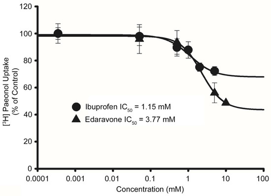 Effect of edaravone and ibuprofen in a dose–response manner (IC50) on the [3H]paeonol uptake in the ALS disease model cell line. The uptake was carried in the presence of edaravone and ibuprofen using varying concentration range 0–10 mM and at pH 7.4. All the data points are represented as mean ± SEM (n = 3).