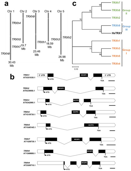 The cytosolic TRX-system consists of h-type TRXs and has been studied in Arabidopsis and other plants, including rice, Medicago and poplar [83,92,97]. The Arabidopsis genome encodes nine TRXh genes that are distributed across chromosomes 1, 3 and 5 (Figure 2a). However, one of the genes, TRXh10 (AT3G56420), is listed as putative in the Uniprot database and therefore is not included in this review. Further analysis is required to show whether the TRXh10 gene is actively expressed or not. Genomic sequences of the h-type TRXs range between 634 (TRXh7) and 1225 bps (TRXh8), with a similar gene-structure split into three or four exons, indicating that all h-type TRXs may have evolved from a common ancestor gene (Figure 2b).